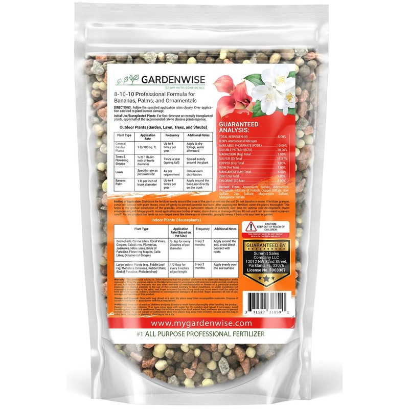 - OPTIMAL FRUIT TREE NUTRITION: Gardenwise 8-10-10 Fertilizer is expertly tailored for a wide range of fruit trees like banana, apple, pear, peach, plum, apricot, and cherry. It supplies key nutrients to facilitate the crucial transition from growth phase to abundant flowering and fruitful harvests.
