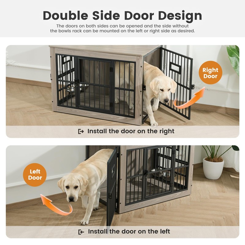 - SAFETY: Metal coating and wood panel surface of dog crate furniture are non-toxic, double safety door locks on the front and side doors can prevent highly anxious dogs from opening the door and escaping, the door lock toggle is purposely made to be thickened and shortened to avoid pets from licking through the gap of the metal bar or pawing the door open, and the rings are to further ensure that pets don't leave the door open.