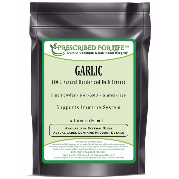 Deodorized Garlic (Allium sativum L.) is odorless and has been acclaimed for its benefits in supporting a healthy immune system, helping to balance circulation and respiratory processes, and its natural anti-aging properties. This 100:1 Garlic Powder Extract in its deodorized form may also be used as a spice or seasoning, but compared to regular garlic there will be little to no change in the overall taste. This ingredient may be added to foods and beverages or smoothies and green drinks and is a light-tan-to-brown powder. PFL Non-GMO Pesticide Free powder extracts are not ETO Treated or Gamma Irradiated. Some typically gummy, oily or damp extracts require an anti-caking agent to maintain its powder form. Non-GMO and/or Organic Tapioca maltodextrins are typically used, in as small amounts as possible. If used, PFL will list it on our label. Most extracts require its use, whether other suppliers disclose it or not. Review the safety article at Prescribed For Life for more information.