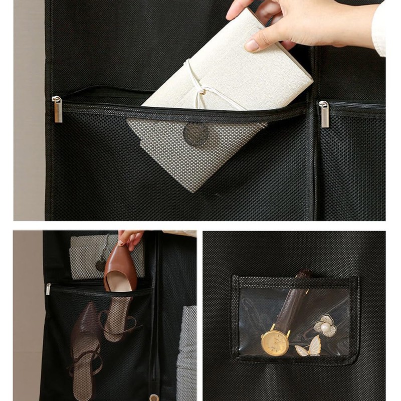 - (Transparent Window and Pockets) The design has a transparent window so you can easily find the clothes you want without having to open the zipper and save your hassle. There are multiple pockets in different sizes for storing shoes, towels, socks, and other small items such as watches, jewelry and more