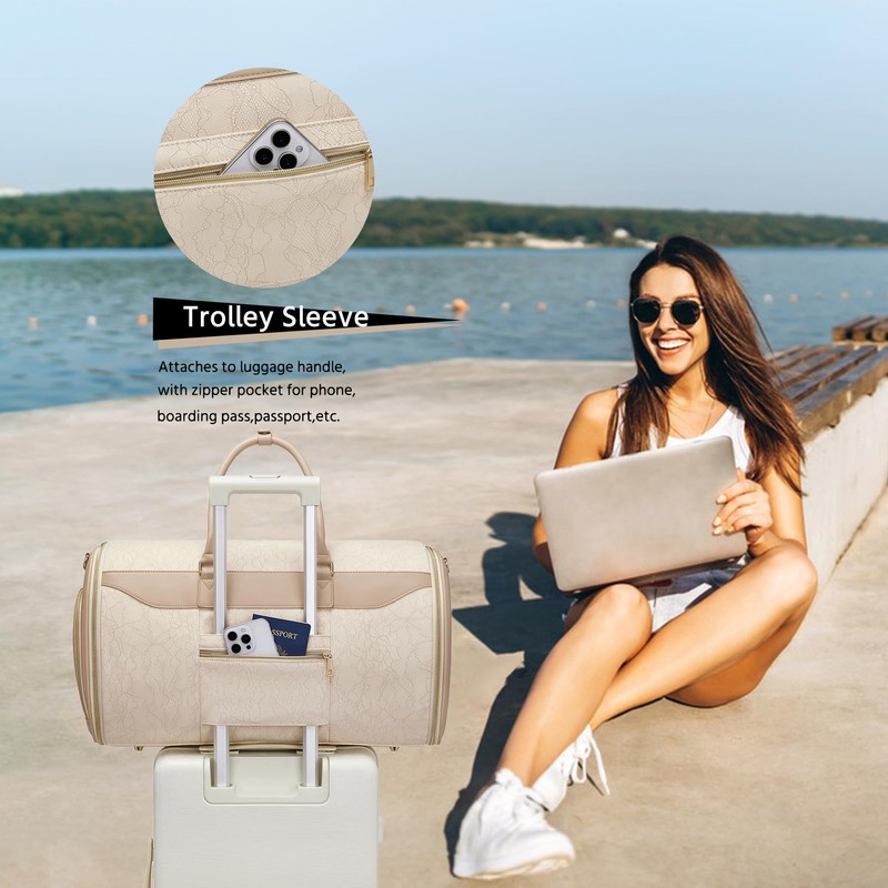 - Perfect Garment Bag for Travel with Suitcase Trolley Sleeve:Back side sleeve allows you to easily slide your bag onto the handle of your suitcase trolley, making it more convenient and comfortable to transport. There also a zip pocket for holding your smartphone, IDs or passport which you need to quick access.Well-made and spacious is an excellent alternative to traditional-looking garment bags, ensuring that both men and women travel in style