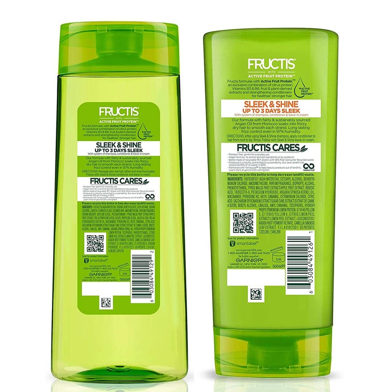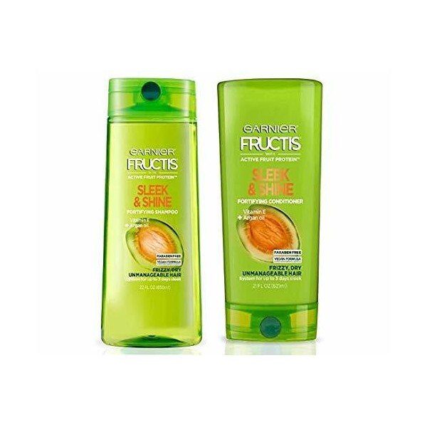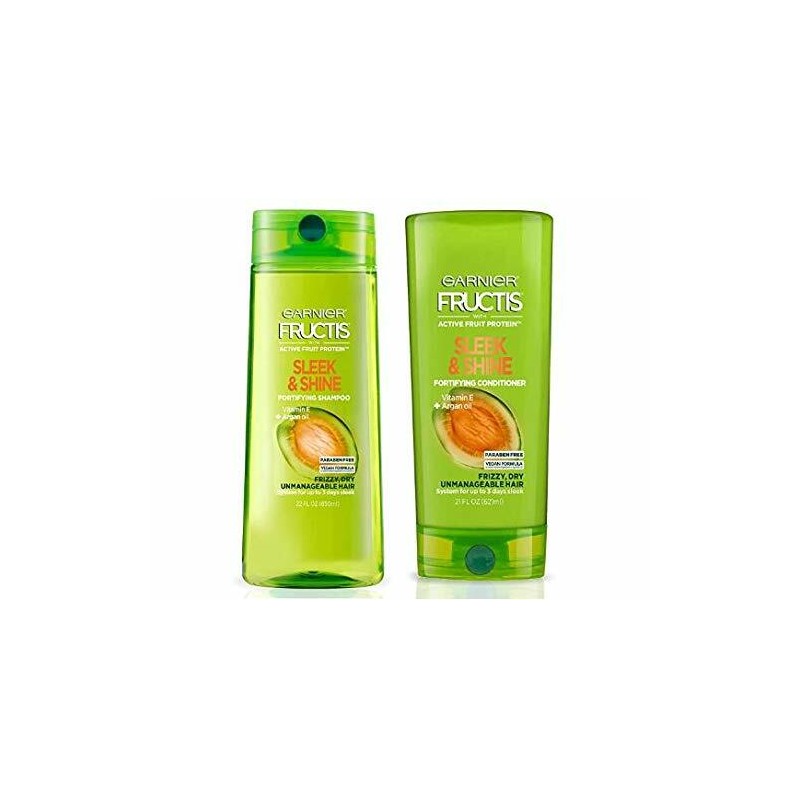 Hair is almost entirely made up of protein, which gives hair its strength. Paraben-free Fructis formulas with Active Fruit Protein, an exclusive combination of citrus protein, Vitamins B3 & B6, fruit & plant-derived extracts and strengthening conditioners, are designed for healthier, stronger hair. Fructis Sleek & Shine Shampoo with fairly & sustainably sourced Argan Oil from Morocco soaks into frizzy, dry hair to smooth each strand. Long lasting frizz control even in 97% humidity*. Get up to 3 day sleek with Sleek and Shine shampoo, conditioner and leave-in cream System provides long lasting frizz control for hair even in 97 percent humidity Argan oil from morocco soaks into frizzy, dry hair to smooth each strand Paraben-free, fortifying formulas, Formulas with Active Fruit Protein