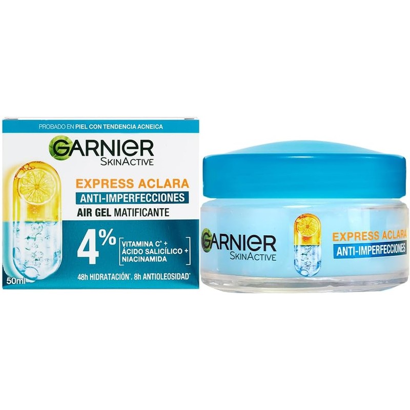 Garnier Express Aclara Crema Hidratante Matificante Anti-Imperfecciones (50 ml/52 g) – Controla la oleosidad, hidrata y combate las imperfecciones. Con Vitamina C, Ácido Salicílico y Niacinamida, mejora el tono, reduce el acné y mantiene la piel matificada y suave. Ideal para pieles mixtas y grasas.