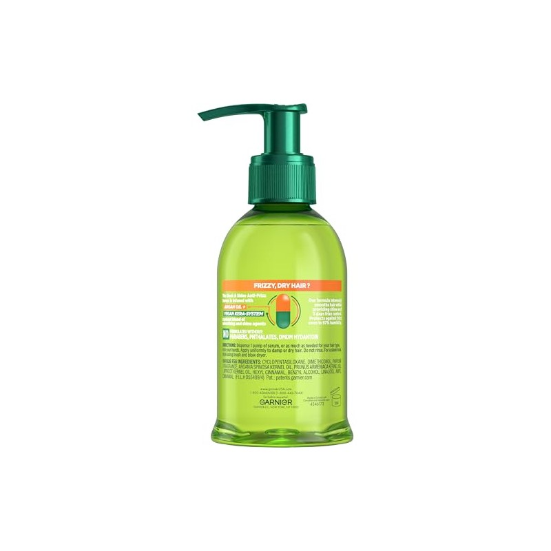 - Garnier Anti Frizz Serum: With the frizz taming power of Moroccan argan oil, this Anti Frizz serum penetrates into frizzy, dry, unmanageable hair for lasting smoothness and shine