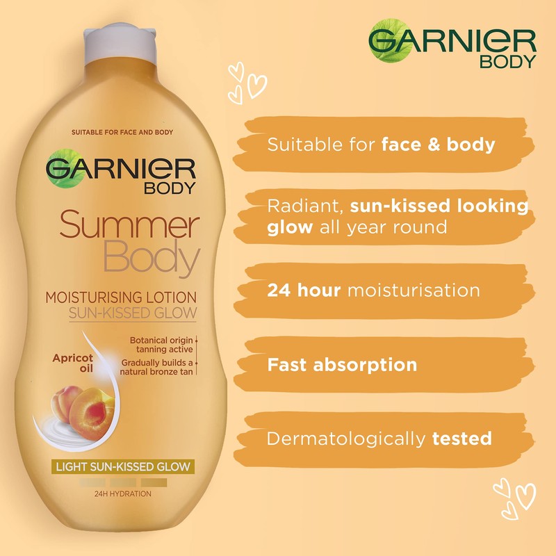 - SUN-KISSED GLOW: Garnier Summer Body Gradual Tan Moisturising Lotion helps build a radiant, sun-kissed looking glow all year round