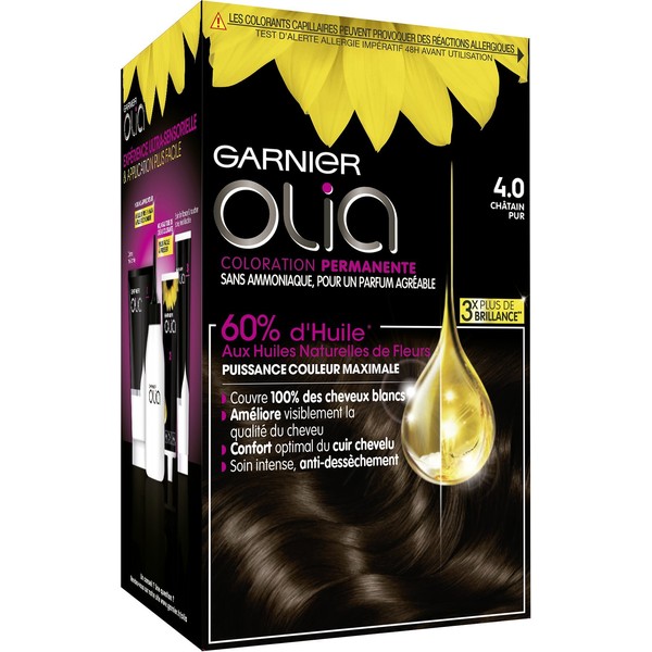 - Box contents: 1 x Garnier Olia permanent dye box, chestnut brown (4.0), including gloves, hot water bottle, milk bottle, colour cream, care and instructions (English language not guaranteed)