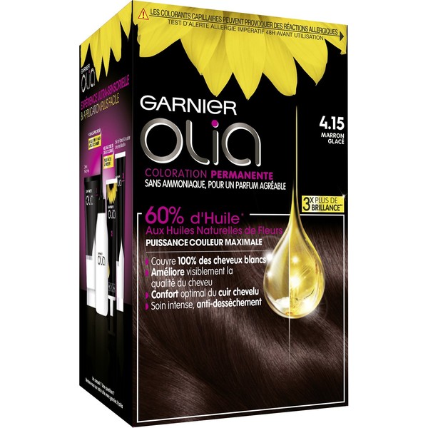 - Contents: 1 x Garnier Olia permanent dye (4.15), including gloves, hot water bottle, milk included, colour cream, care and instructions (English language not guaranteed)