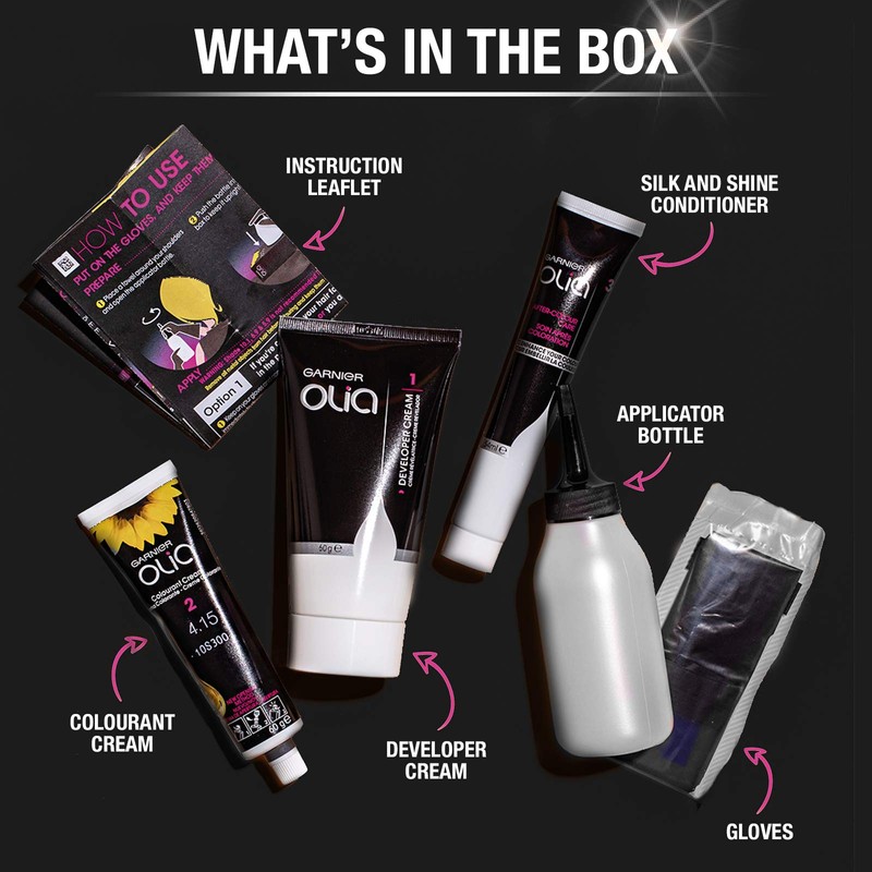 - Oil Powered Permanent Hair Dye: Olia is an ammonia free hair color kit for brilliant color and visibly healthier looking hair; Using an exclusive 60 percent oil blend with natural flower oils, Olia has a unique no drip cream formula