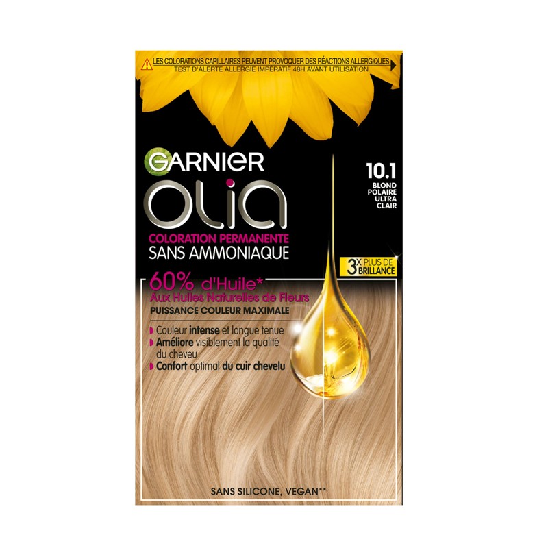 - Contents: 1 x Garnier Olia permanent hair colour, ultra-bright polar blonde (10.1), box contents: gloves, hot water bottle, developer milk, colour cream, care and instructions (English language not guaranteed)