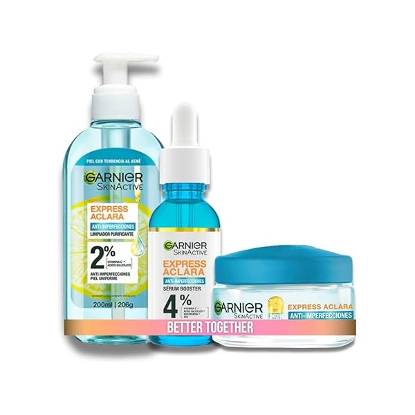 - Rutina completa anti-imperfecciones para piel grasa: 1.Nuevo Gel Limpiador Facial Express Aclara Anti Imperfecciones para piel con tendencia al acné tratamiento concentrado. 2. Sérum para piel grasa con tendencia al acné, tratamiento concentrado (Ácido Salicílico + Vitamina C + AHA) con Niacinamida para tratar imperfecciones y manchas por imperfecciones. 3. Hidratante en gel de Garnier Express Aclara Anti-Imperfecciones. Matificante Anti-imperfecciones, controla oleosidad e hidrata