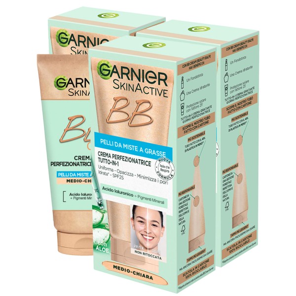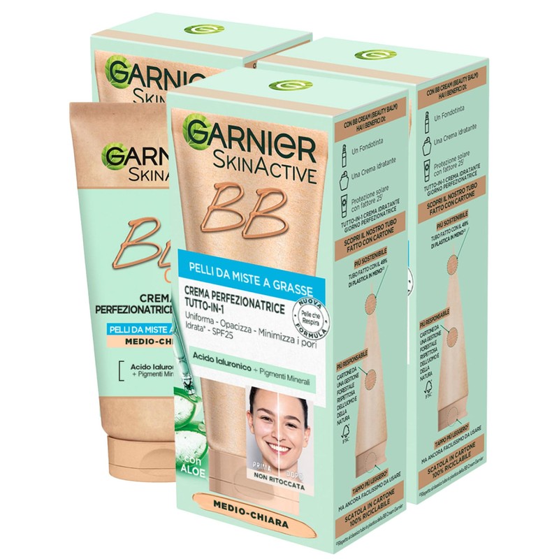 Garnier SkinActive BB Cream All-in-1 Perfektionierende Gesichtscreme Kombination zu fettiger Haut SPF 25 Aloe Vera Hyaluronsäure Feuchtigkeitsspendende Mattierende mittelleichte Tönung - 3 Flaschen à
