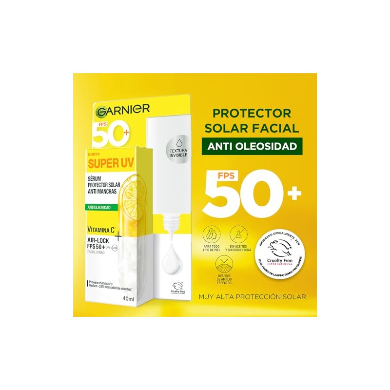 🌟 ⭐ Garnier Super UV Protector Solar Facial Fluido Anti Oleosidad con Vitamina C, con Textura Invisible y Ligera, 40ml ⭐ 🌟