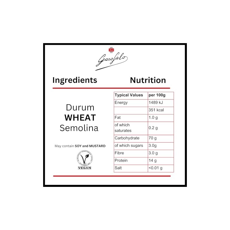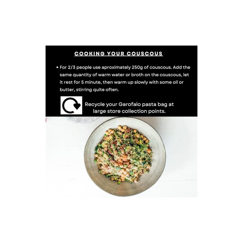 Product DescriptionCouscous made by Pasta GarofaloIngredientsDurum WHEAT semolinaDirectionsFor 2/3 people, 250 g of couscous: add the same quantity of warm water or broth on the couscous, let it rest for 5 minute, then warm up slowly with some oil or butter, stirring quite often.