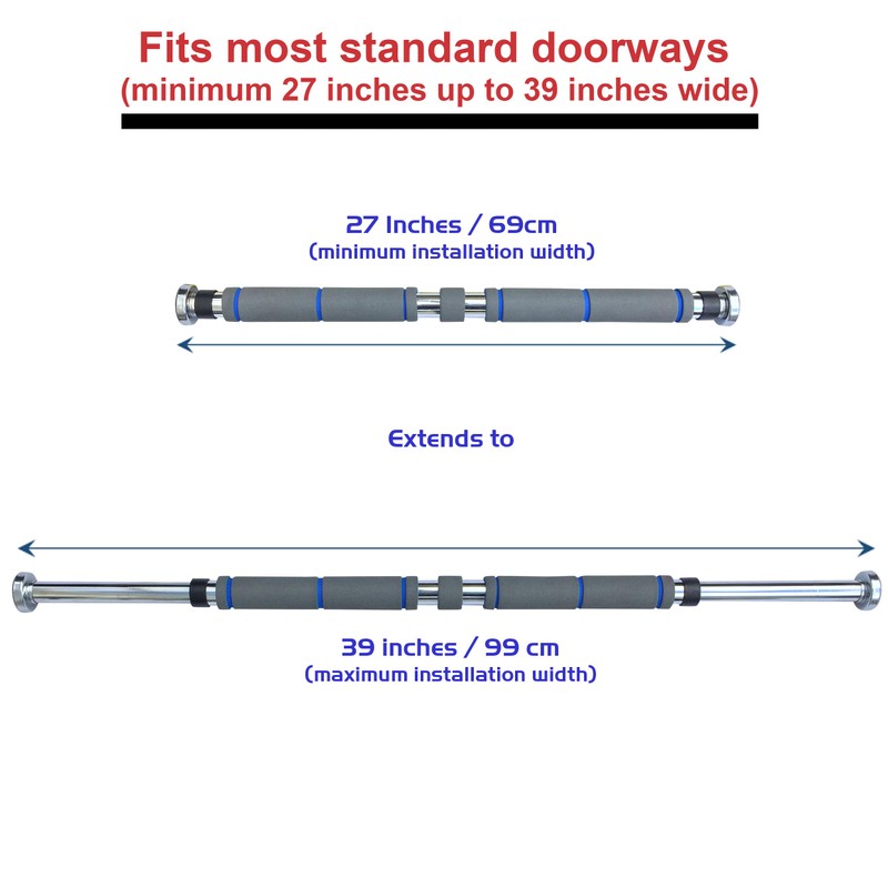 With the Maximiza, you need minimal space in your house to do highly effective bodyweight exercises. The heavy duty chrome steel bar and the multiple screw-in door mounts provide safety and stability while giving you the flexibility to move it to different places or heights. The non-slip extra-long foam grips provide a firm grip and extra comfort to minimize hand fatigue. The Maximiza Pull Up Bars fit standard doorways between 26 and 39 inches wide. They come with 3 sets of heavy-duty door mounts which can be screwed into up to 3 wooden doorframes.