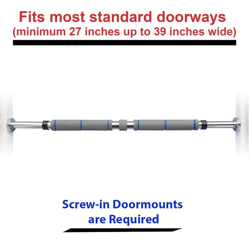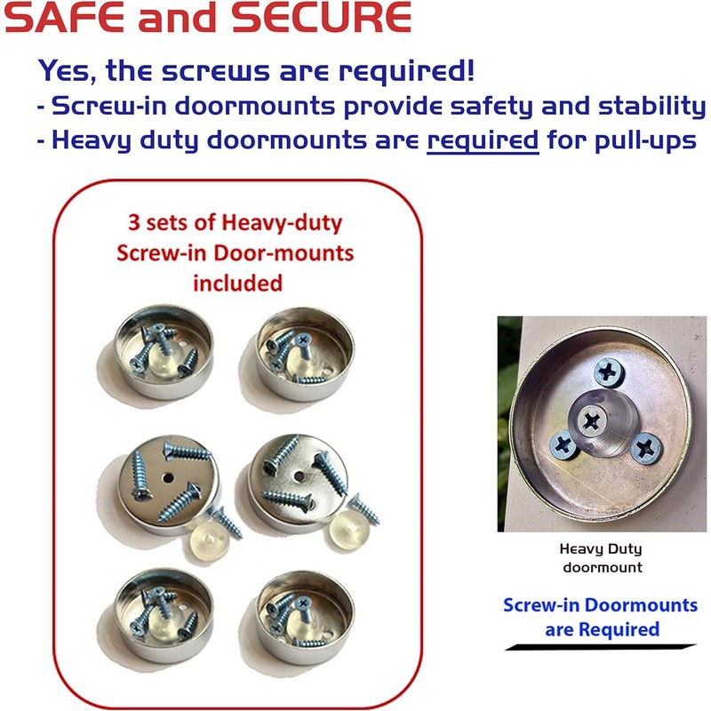 - Safe and Secure - Heavy-duty chrome steel doorway pull up bar and door mounts provide great support and safety. Note: Always install and use the supplied screw-in door brackets (comes with 3 sets of heavy-duty door mounts)