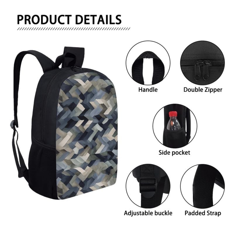 Garronmavis Camouflage Gray Stripes 17" College Backpacks Sets Geometric Stripe 3 Pieces Lunch Bag Modern Art Large Capacity Pencil Case for Student