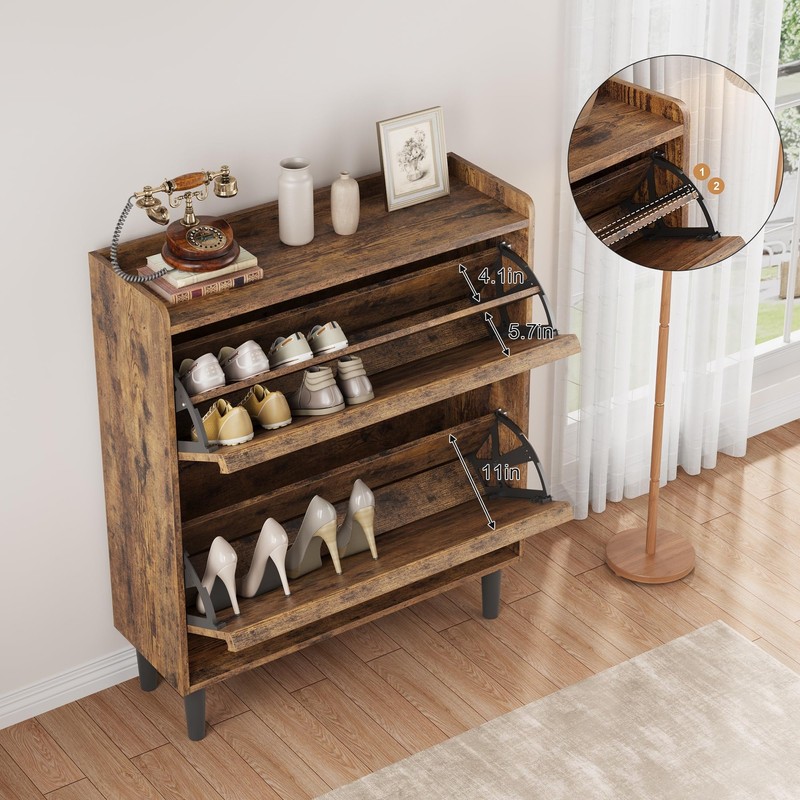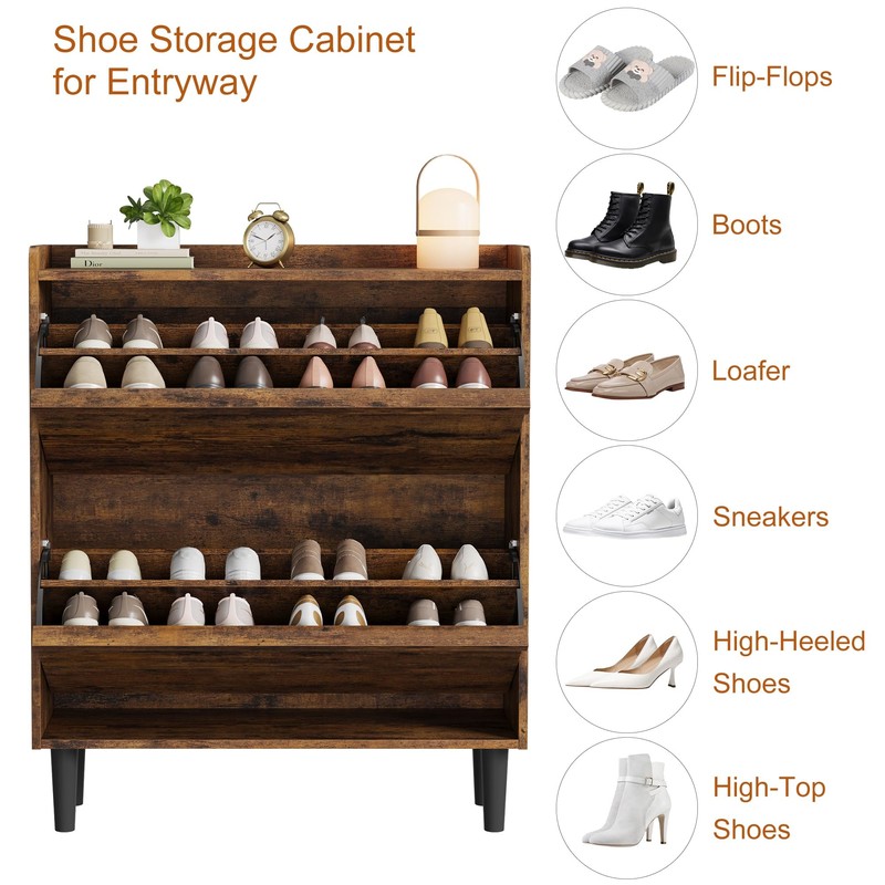 - STURDY STRUCTURE: Constructed from high-quality MDF engineered wood, this shoe cabinet guarantees strength and durability. Its thick waterproof desktop provides excellent stability with a load-bearing capacity of 25 pounds, while each interior layer is designed to support up to 12 pounds, ensuring ample support for your footwear
