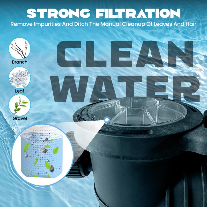 - đăRobust Constructionă: Crafted from commercial-grade reinforced thermoplastic, this pool pump resists corrosion and provides superior strength and durability. The extra-large removable filter basket design makes cleaning a breeze, extending the life of your pump and ensuring consistent performance.