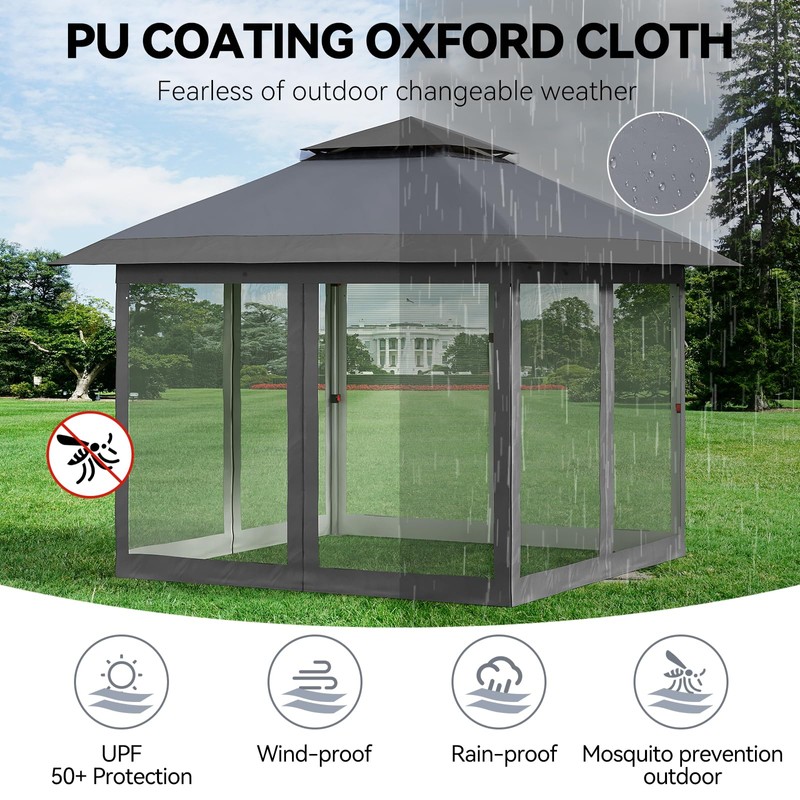 - [Double Ventilation Design] -- vented top with the ventilation hole, helps to enhance the air circulation inside the gazebo. Portable with a 600D Oxford cloth carry bag, fitting most car trunks, ideal for outdoor activities, camping, picnics, and parties.
