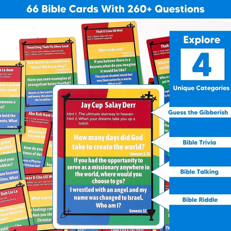 - Foster Growth: Our Bible game combines fun with learning, featuring 4 categories of bible cards: "Biblical Riddles," "Bible Trivia," "Guess the Gibberish," and "Bible Talking." These Bible cards are thoughtfully designed with clear language, and each category sparks meaningful conversation & thinking about faith