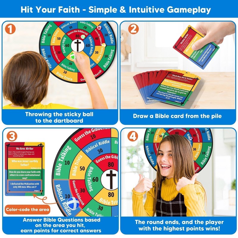 - Simple Gameplay: Players take turns throwing sticky balls at the dartboard and answer questions based on the area they hit. It tests both bible knowledge and physical coordination. Guide your children and teens to engage in faith conversations, and give them the opportunity to share their thoughts and perspectives with adults
