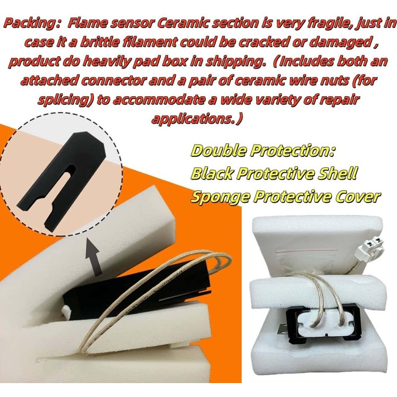 • MEE61841401 MEE61841403 fit for L-G oven igniter replacement comes with a wire connector plug and 2 pieces ceramic nuts (for splicing). Flame sensor Ceramic section is very fragile, just in case it a brittle filament could be cracked or damaged we do heavily pad box in shipping.temperature normally and extend the life of your stove or oven