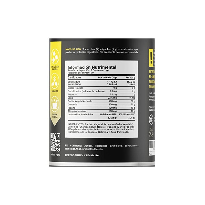 Gas Relief de 180 cpsulas. Ingredientes naturales Carbn Vegetal, Camomila, Papana, Alfa-Galactosidasa, Probiticos. Gas Relief B Life.