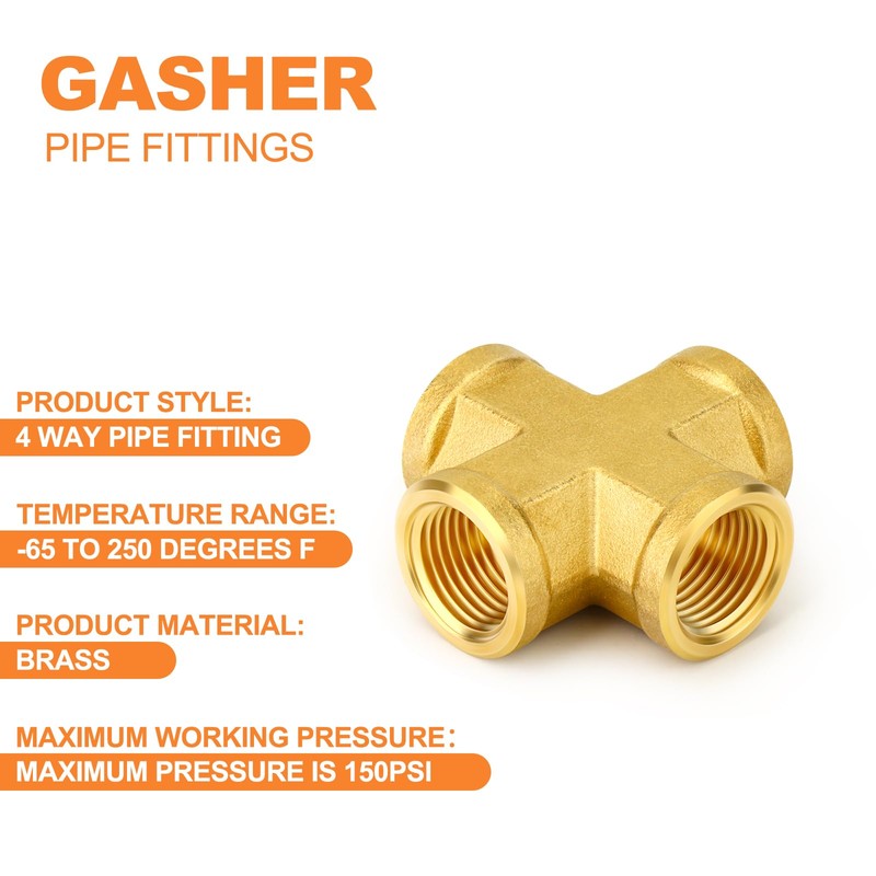 GASHER 5PCS Brass Pipe Fitting, Cross 4 Way Pipe Fitting, 3/8" x 3/8" x 3/8" x 3/8" NPT Female Pipe