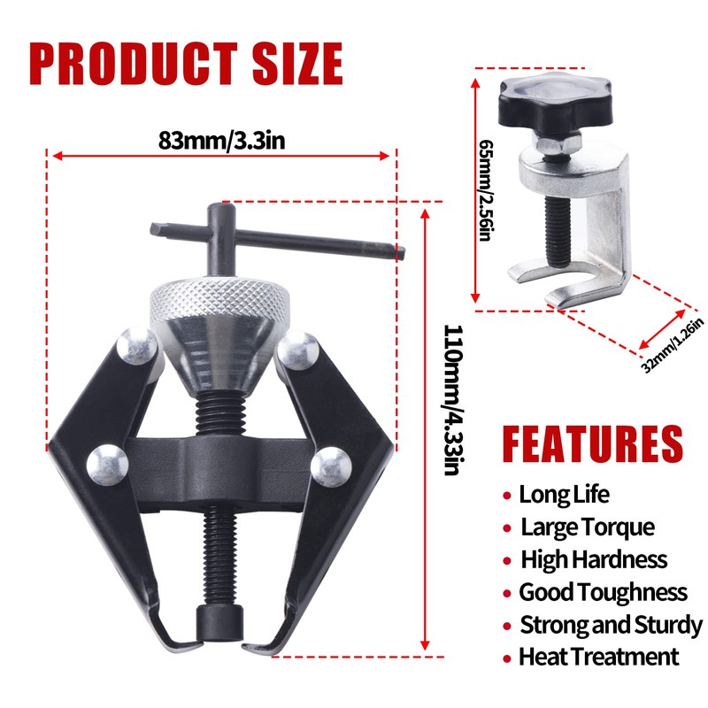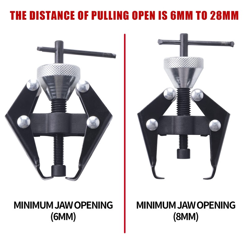 • Jaw opening: 1/16" - 1-1/16" (6-28mm); Outer diameter:1-7/8" (48mm); Package Included: 1 x Wiper Arm and Battery Terminal Bearing Remover Puller Tool & 1 x Wiper Arm Remover(Collar Size: Approx.15.2mm )