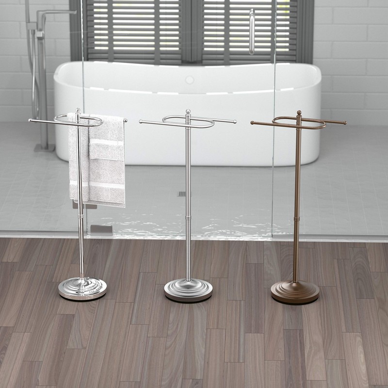 Beautifully display towels anywhere in your kitchen or bath with our stand- alone S-shaped towel holder. Frees up space under sinks, on shelves, countertops, tables, and vanities. Built of high caliber metal for decades of reliable use. This style flows seamlessly with both modern and transitional themed bathrooms. Easily place on top of any floor surface such as tile, carpet, hardwood, or laminate, requiring no drilling or installation. Dual arm design provides space for two towels and can double as a jewelry tree for bracelets, rings, and necklaces. Perfect for holding and drying dish towels in the kitchen and guest towel in the bathroom. Functionally constructed with weighted and padded base to avoid tipping and prevent scratching of your floors. Stands 38 inches tall, large enough to fit standard bath towels, pool towels, tea towels, fingertip towels and small hand towels. Available in a variety of styles and finishes to match your current bathroom decor. All Gatco products include a 100-year .