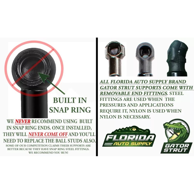 Each "Gator Strut" lift support gas strut is engineered, and manufactured beyond OEM industry standards to provide smooth operation, and longer lasting performance. Lift supports should be replaced in pairs (if applicable) to ensure safe, reliable support of your application. Choose Gator Strut by Florida Auto Supply for all your replacement lift support needs.
