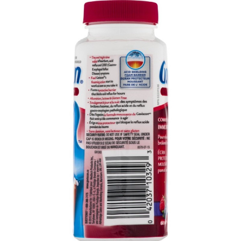 Gaviscon Extra Strength Chewable Foamtabs begin working immediately. Provides day & night-time relief of heartburn, acid reflux and GERD (Gastro-Esophageal Reflux Disease) symptoms. Doctor recommended Gaviscon forms a protective foam barrier that blocks acid reflux for hours. Free from aluminum, lactose & gluten. Free from aluminum, lactose & gluten. Fruit Blend flavour; 60 count.