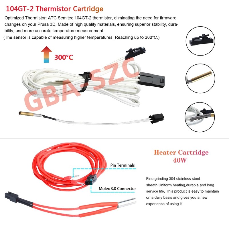 - 5、Optimized thermistor: Features an ATC Semitec 104GT-2 thermistor, eliminating the need for firmware changes on your Prusa 3D, made of high quality materials, ensuring superior stability, durability, and more accurate temperature measurement. Avoid problems during printing, provide users with a better printing experience.(The sensor is capable of measuring higher temperatures, Reaching up to 300°C.)(Note: This kit needs to be installed by yourself)