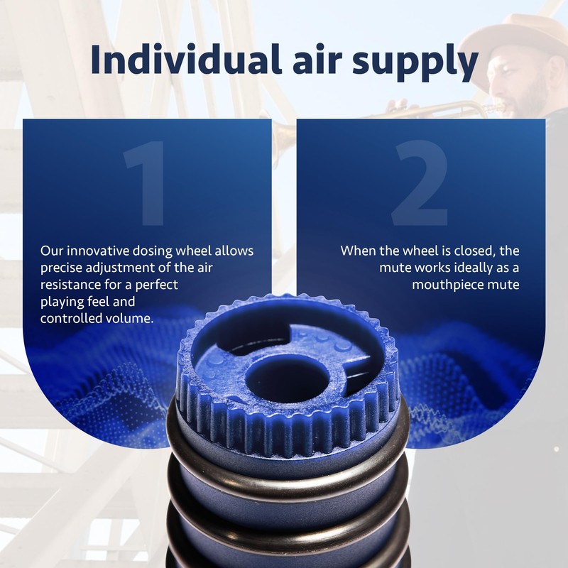 Innovative dual function - Our premium mute significantly dampens the sound and allows you to practice in apartments or houses without disturbing others. The alternative use as a mouthpiece mute minimizes mouthpiece buzzing. Made in Germany - High-quality, break-proof materials and first-class workmanship from Hamburg for professional musicians. Trumpet mute silencer C Patented in Germany! Excellent intonation - Compared to many other trumpet mutes, the intonation remains almost unchanged C ideal for demanding players. Thanks to the super-light material, there are no vibration or humming noises. Individual air supply - An integrated dosing wheel enables precise adjustment of the air resistance for a perfect playing feel and controlled volume. Suitable for all trumpets - Thanks to removable rings, the trumpet mute optimally adapts to different sound cup sizes. The rings also have the FDA seal.