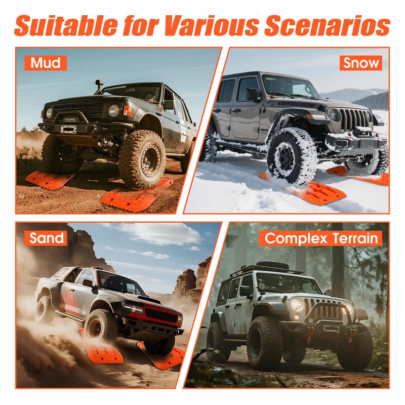 - 【Exceptional Flexibility】Designed with a diamond array construction on both sides, these off-road traction boards provide dependable grip on various terrains, facilitating efficient vehicle recovery. Moreover, the traction boards are capable of bending up to 120° without damage, offering increased flexibility for a wide range of applications