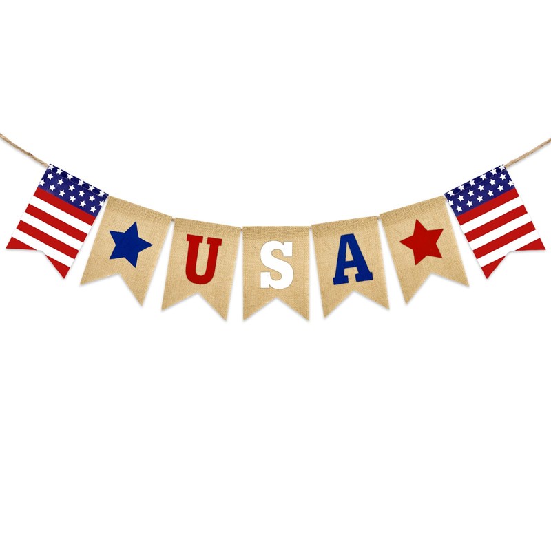 - [PATRIOTIC DECOR] - Perfect for July 4th celebrations, these USA burlap banner is ideal for Independence Day, Memorial Day, Labor Day, Olympic Party, Presidents' Day, and Decoration Day. They can be hung in your dining room, mantel, fireplace, windows, walls, porch, dessert table, buffet table, or gift table. They add a little something in they empty space you don’t know what to put there!