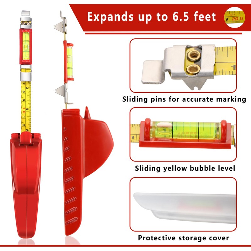 - Accurate Measurement: The hanging tool includes a sliding yellow bubble level and sliding pin, guiding users to mark the wall accurately at the required position for horizontal or vertical hanging, eliminating the need to record the length of the drawing like a regular tape measure.