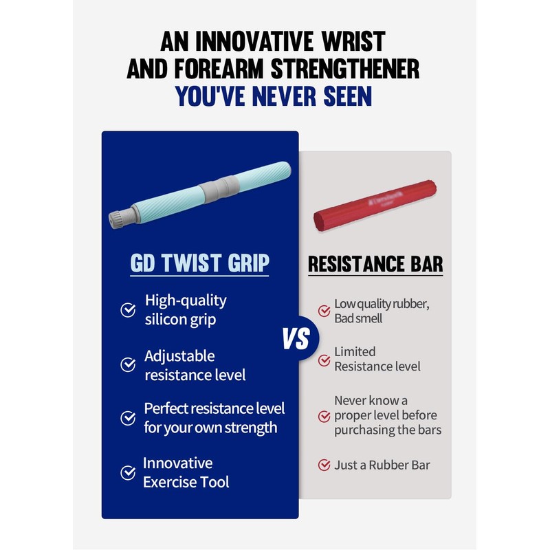 - INNOVATIVE FOREARM STRENGTHENER YOU'VE NEVER SEEN - GD Twist Grip is an innovative workout equipment that strengthens grip, wrists, and forearm muscles with amazing convenience! It is a wrist blaster that can train your forearm muscles without weight discs like wrist rollers. You can perform wrist flexion and extension exercises by using the force of the spring at the center. You can strengthen your wrists and forearms to prevent injuries like golfer’s elbow and tennis elbow.