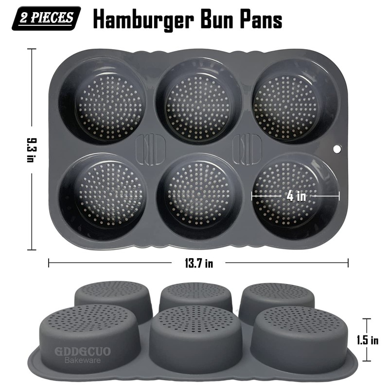 • 4" STANDARD LARGE SIZE HAMBURGER BUN PANS: GDDGCUO 6-Cup Nonstick Burger Bun Mold has 4" large size deep cavity and help you make nice sized homemade hamburger buns. Accelerate even heat, designed to last. Flexible enough to maintain its original shape after every use