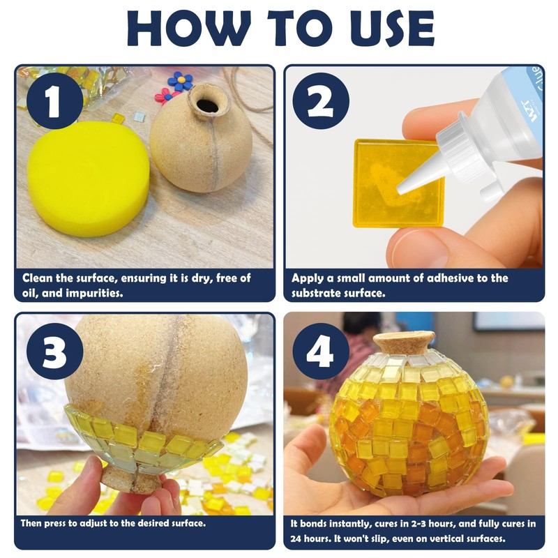 • Quick Drying Clear Coating: The mosaic glue non-drip gel texture ensures precise adhesion to the applied location. Our mosaic glue surface takes 2 hours to dry and 24 hours to fully cure. After drying, the coating is crystal clear, perfectly preserving the beauty and details of the artwork