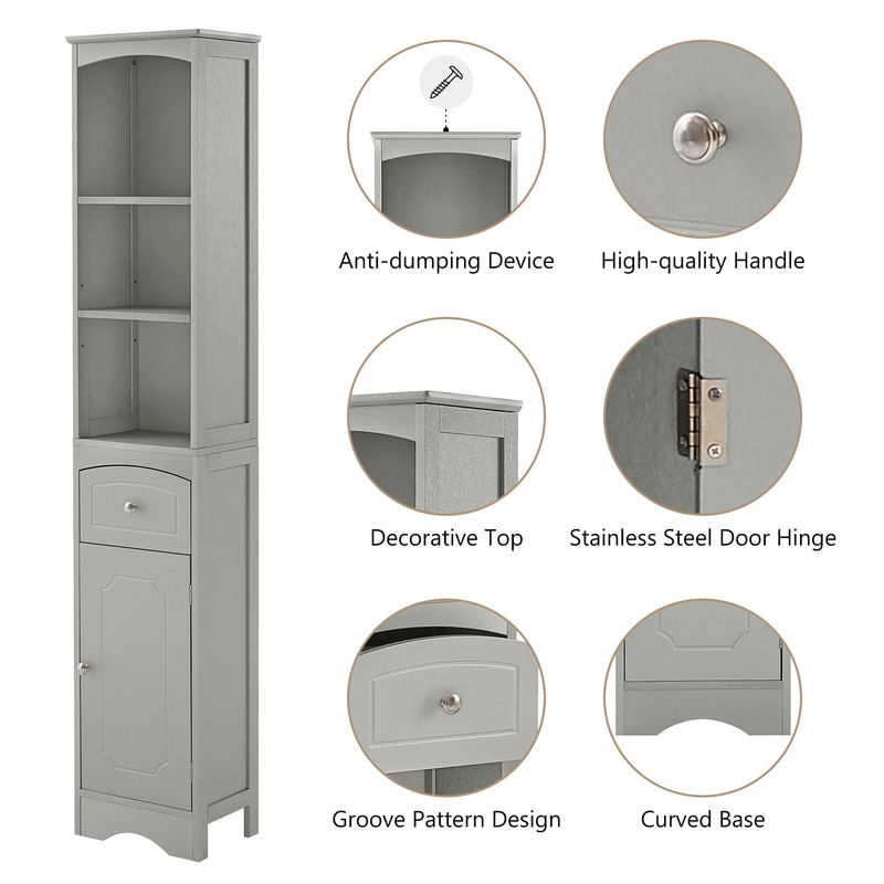 Maximize bathroom storage with this tall freestanding cabinet, blending style and functionality. Its slim profile (ideal for corners) offers 3 adjustable open shelves, 1 spacious drawer, and 1 enclosed cabinet—perfect for towels, toiletries, and essentials.
