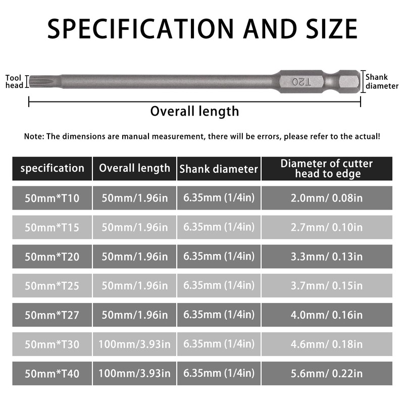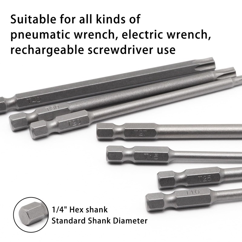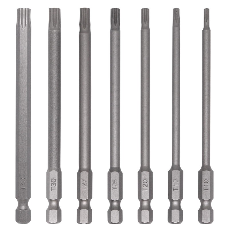 - star screwdriver set: set contains 7 sizes torx bits, t10, t15, t20, t25, t27, t30, t40, 4 inches (100 mm) long.