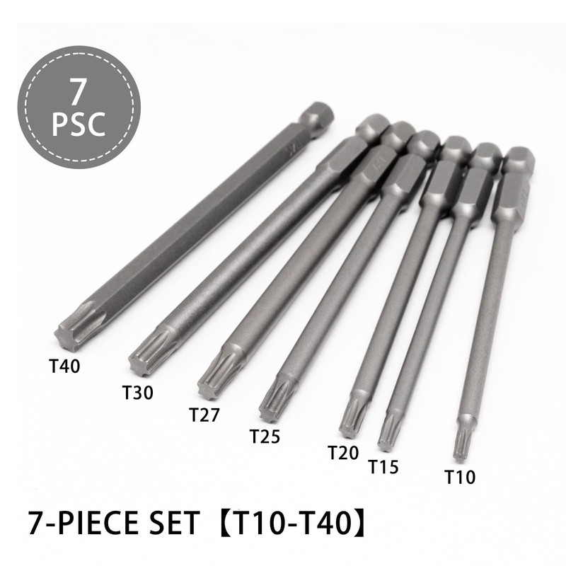 Set contains 7 sizes torx bits, T10, T15, T20, T25, T27, T30, T40