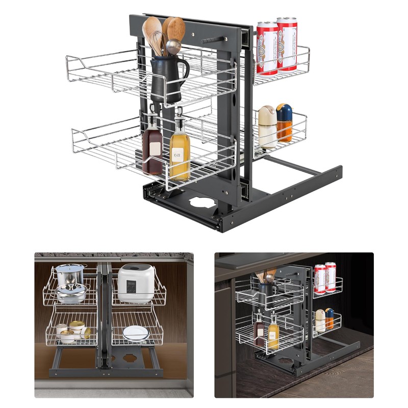 • 【Maximize Blind Corner Cabinet Storage】-This 2-tier pull out organizer is specially designed for blind corner cabinets, utilizing wasted corner space efficiently. With four spacious baskets and soft-close rails, it provides seamless access to kitchen essentials without digging or bending.