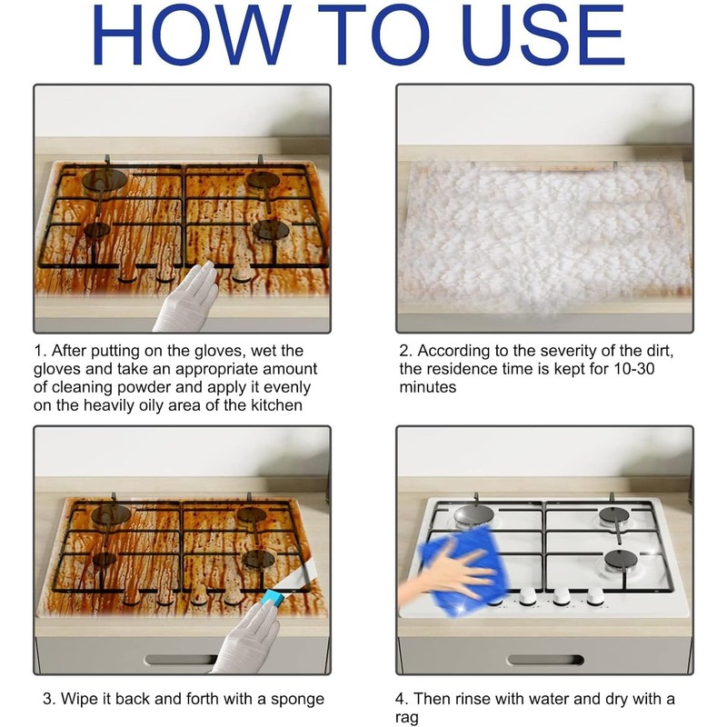 • Easy to Use Add an appropriate amount of hot water to the mof chef cleaner powder, soak the part to be cleaned for more than 15 minutes, then clean it with a brush, and finally rinse it off with clean water. It's that simple, and it effectively rids your kitchen of unwanted grease.