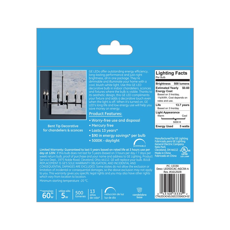 • LONG-LASTING: The LED Light Bulbs are rated to last 13 years based on 3 hours of daily use. These long-lasting GE chandelier light bulbs will not disappoint.