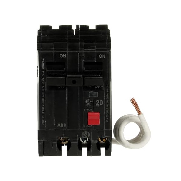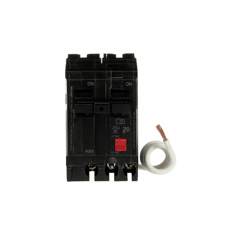 ABB Q-Line® THQL2120GFT 20A Double Pole Circuit Breaker • 20 Amp Double Pole Ground Fault Breaker with Self-Test • 120/240 VAC 2-Pole GFCI Breaker • Ground Fault Circuit Interrupter