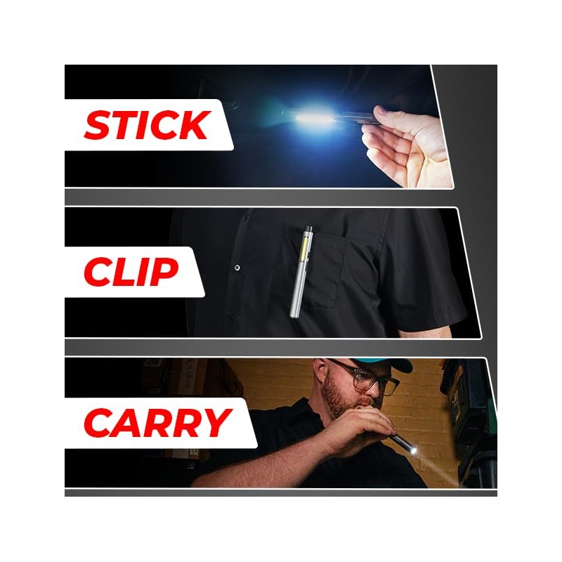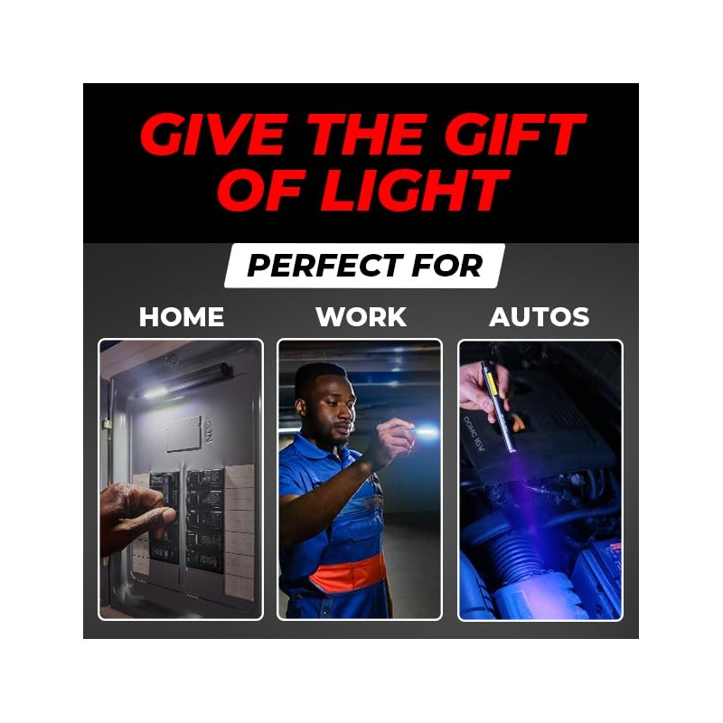 - Bright & Mulit-Mode: This COB LED Flashlight is has 3 different modes including a pen light, flood light, and 365nm UV light. This worklight will help to illuminate the darkest of spaces and has the perfect mode for any situation. This super bright worklight is the perfect gift for Dad.