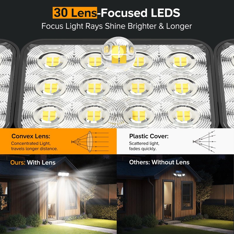 - 2000LM Super Bright&Unique Design GEARLITE Solar Security Light features a specialized lens-focused LED shade that enhances brightness by effectively concentrating the light. Unlike many other solar lights outdoor garden on the market that rely on a larger number of LEDs, our design features a convex lens, which directs and amplifies the light output. As a result, it delivers up to 2000LM, offering superior illumination compared to standard solar security lights outdoor with motion sensor. This unique design concentrates the light, delivering greater brightness and longer life while using fewer LEDs.