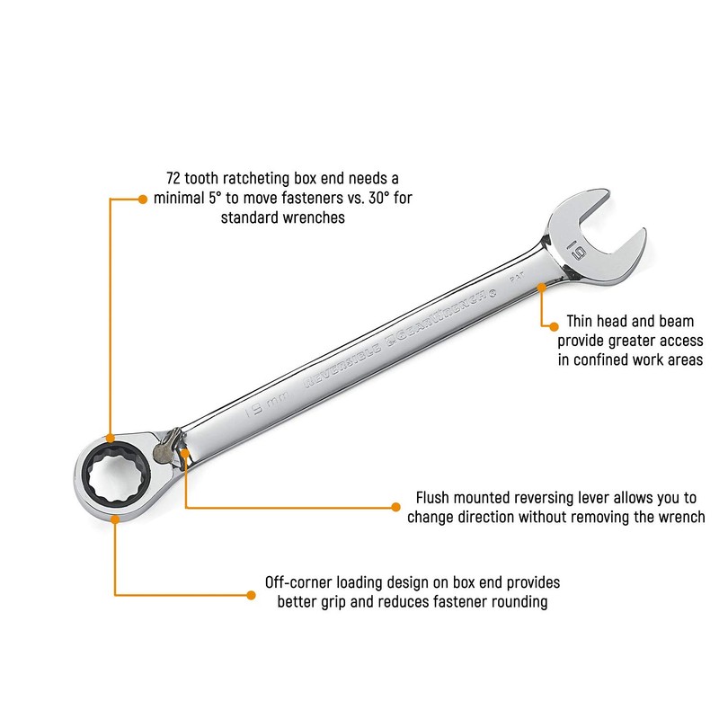 - Ratcheting box-end needs as little as 5 degrees to move fastener VS. 30 degrees for standard box end wrenches